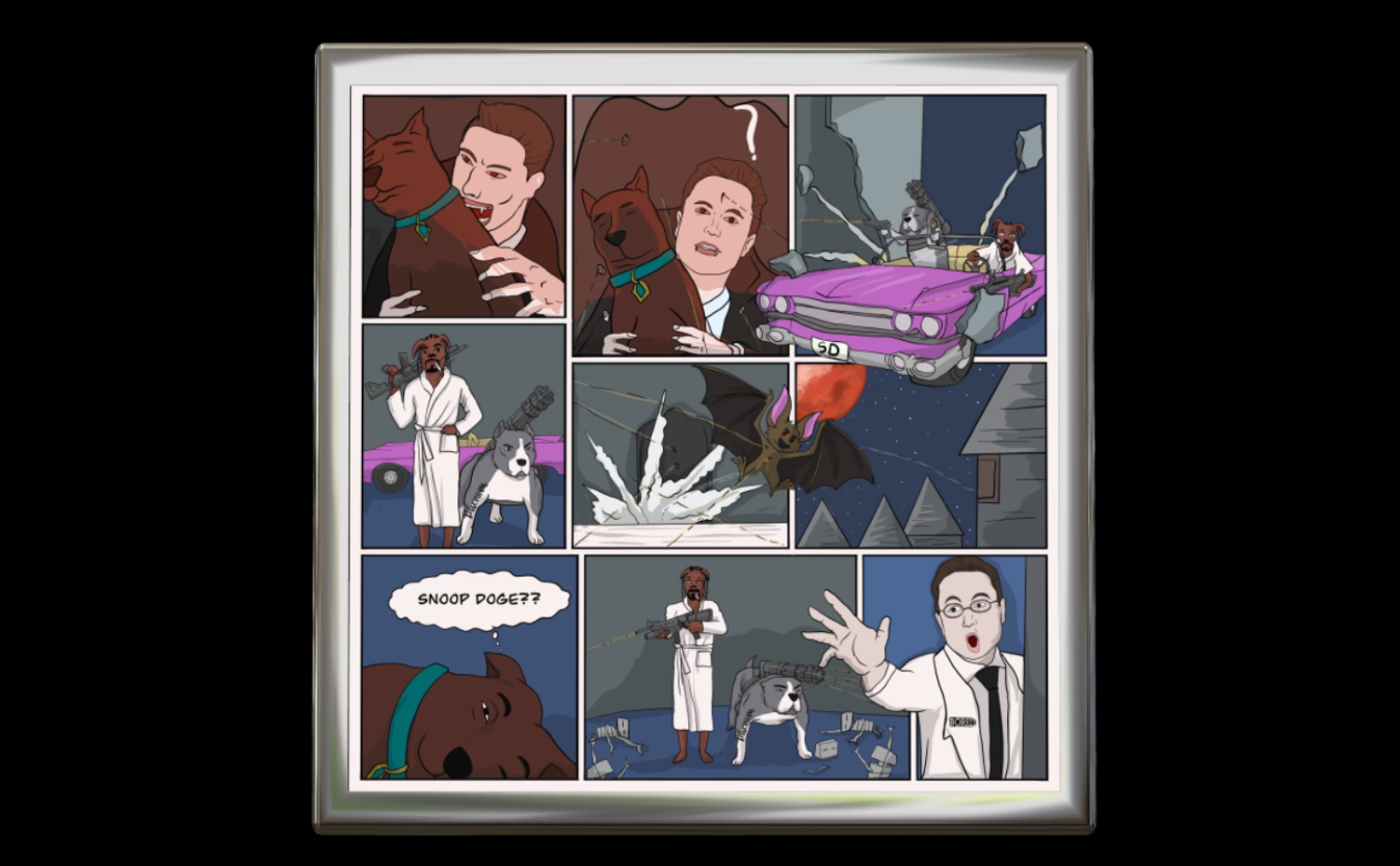 Scoobi wakes up after the fall and tries to understand the situation. In front of him, he sees the other dogs, namely Snoop doge and Phenom, the big heavyweight strong dog in the middle of the room spraying clouds of bullets to the little robots. When suddenly appears from the shadows, a kind of Draculon Musk look-alike, resembling at a scientist, it’s Boredulon Musk, the hidden brother, and he begs them to stop slaughtering his robots’ serving army.
